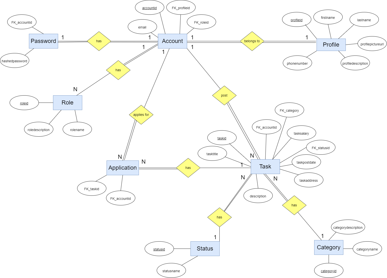 Our design choice is that there is no account without a profile. It means that when account is created, a profile is automatically created as well. Every account has a role, admin or member, while member is a default one. An account can post a task, which has to be assigned to a category - indoor or outdoor. A single task has also a status, in order to inform others if it is still available or expired. As an extra feature, every account can apply for a any task, unless it's not their own.